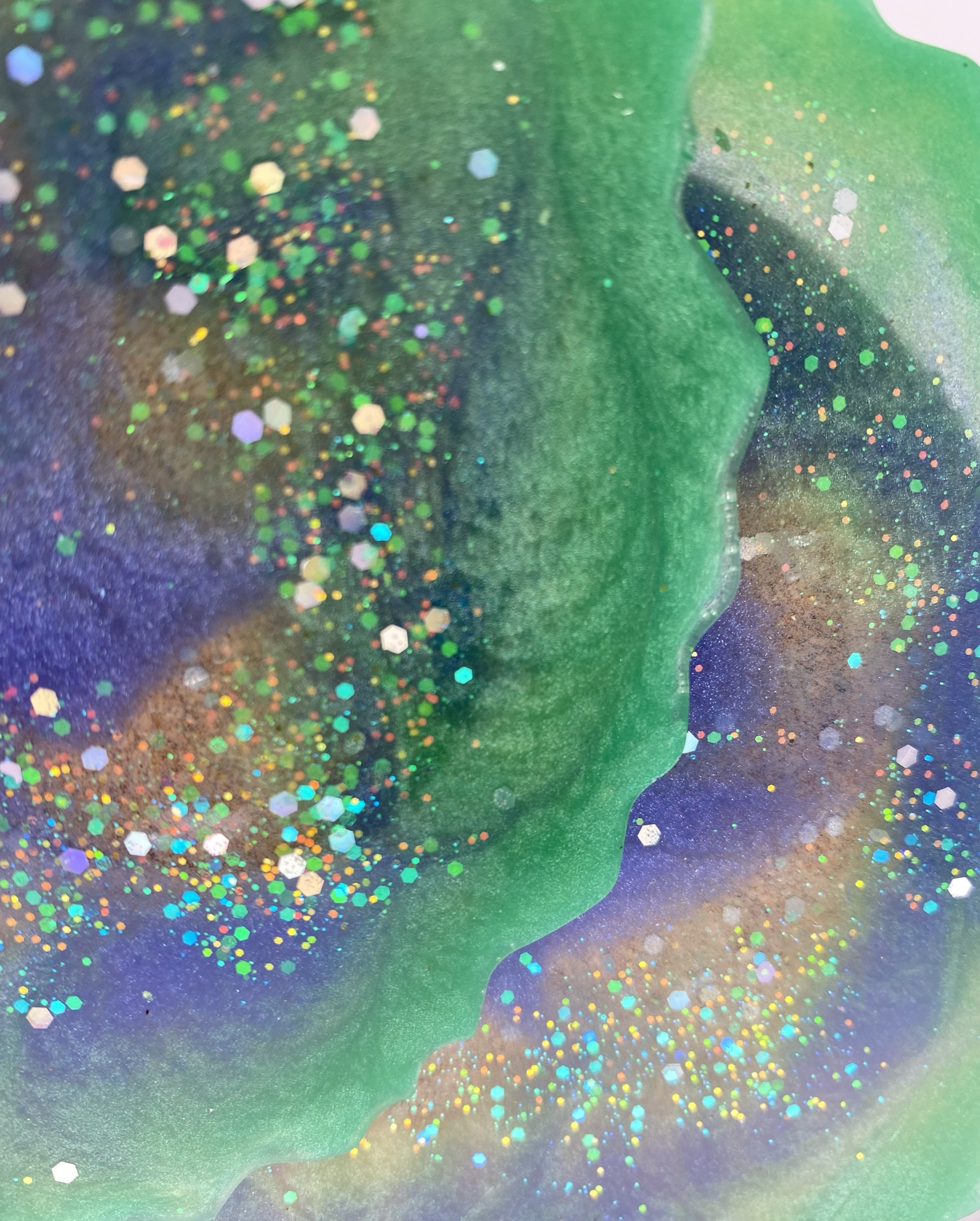 Pretty set of 2 for $15. These sell faster than I can update on the site but there are so many color combinations to choose from. Your imagination is our only limitation. You choose your color combination and I will make them custom for you. There are three styles to choose from; Geode style edges, Scalloped style edges and Flower Shaped. You’ll see them all displayed in the gallery. Both sides are equally decorative. They are a fun addition to any home decor. Sets of 5 or more are specially priced as requested.