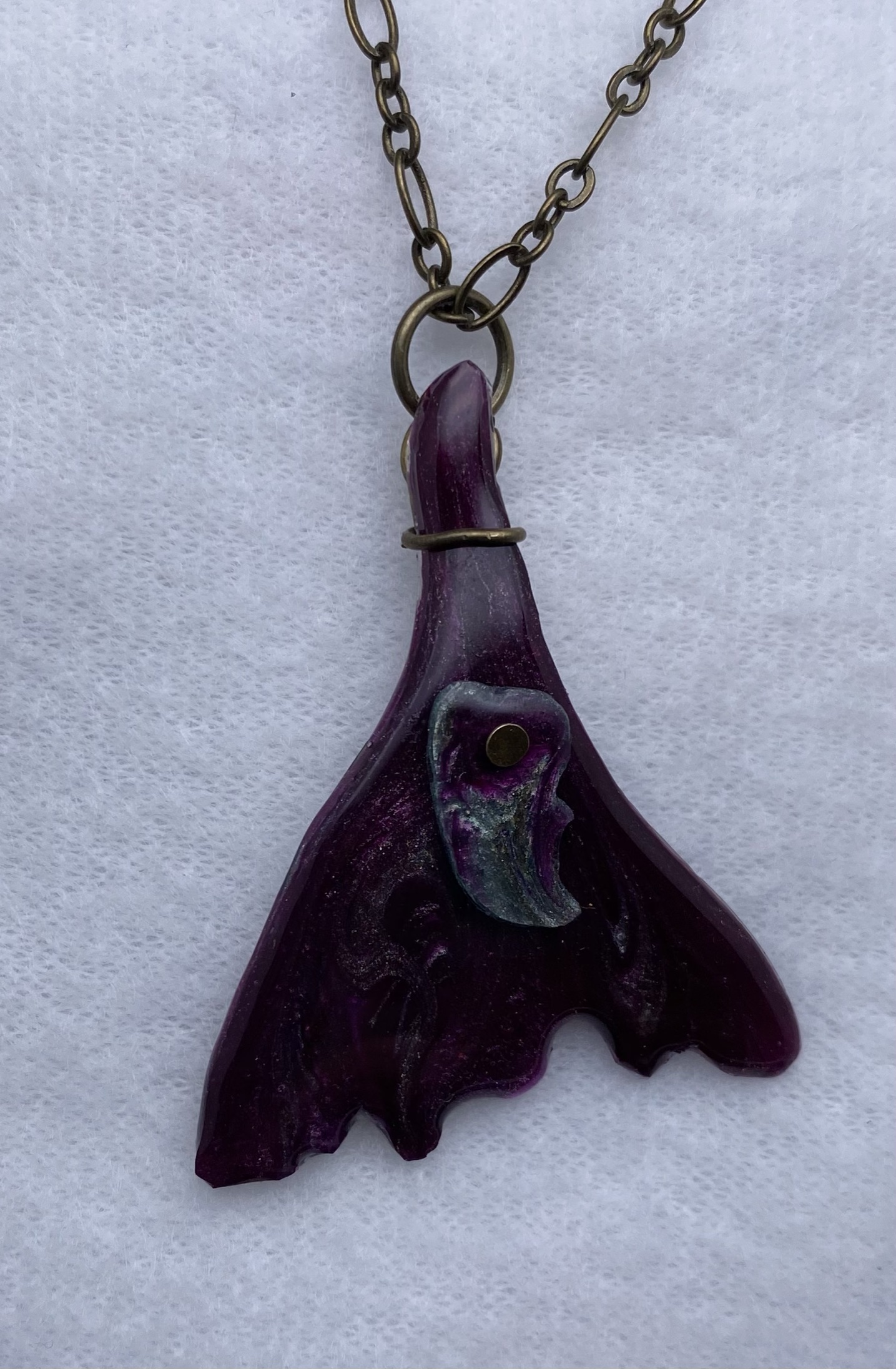 This fun and unique pendant has the perfect combination of shimmery deep purple and frosty pale green accents. The pendant and attached accent piece are acrylic resin and made to last! A true one-of-a-kind piece would make a great gift for someone special or a treat just for you. Current chain is 15″ but can be adjusted upon request.