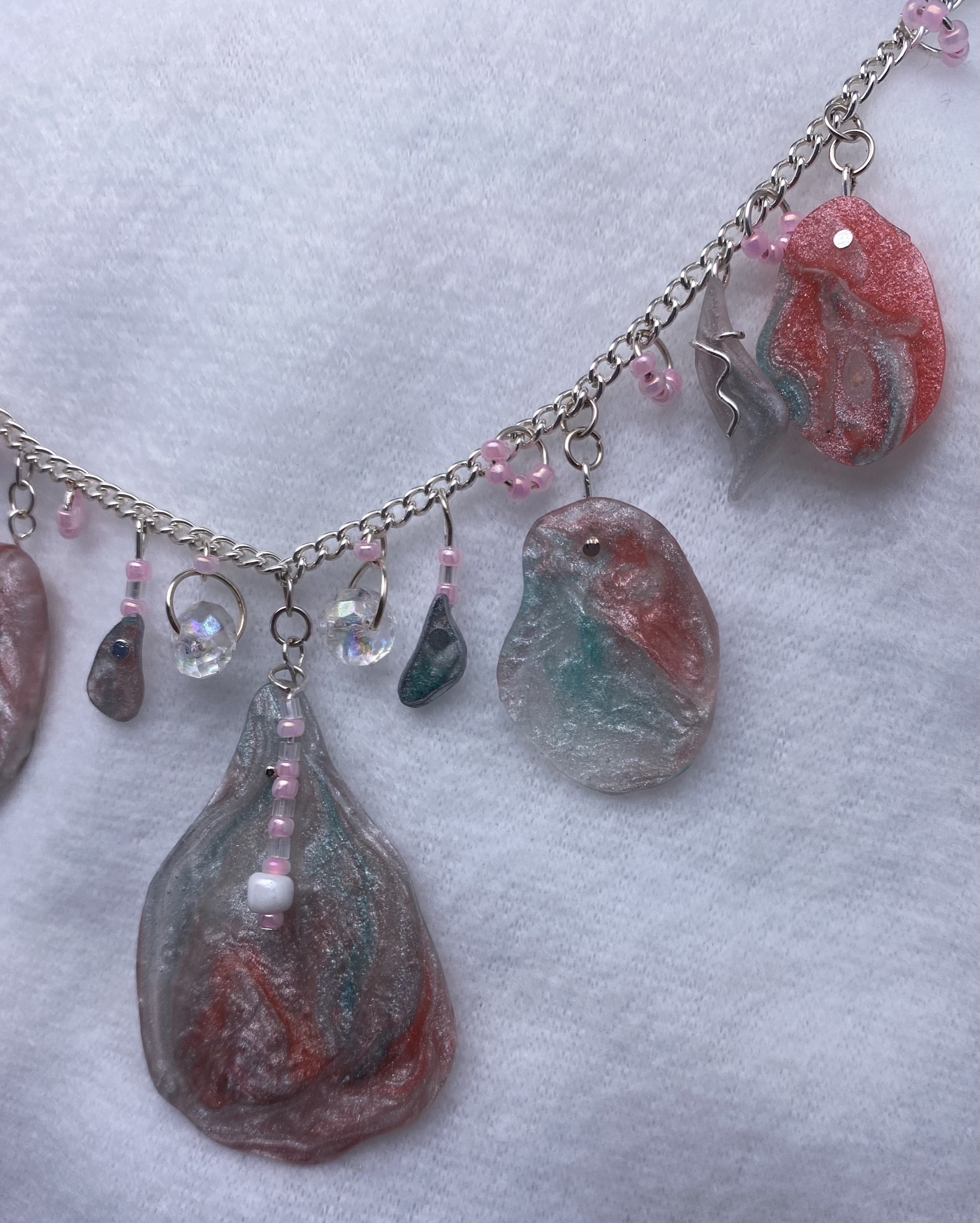 Wearable art! This pretty and flattering necklace has multiple resin droplet pendants and additional beading that make this piece a true one-of-a-kind. Each resin pendant is created by hand and sanded, formed and embellished to create a wearable work of art. It is currently 21″ in length but can be shortened by request. See the Frosty pink earrings for a beautiful matching set.