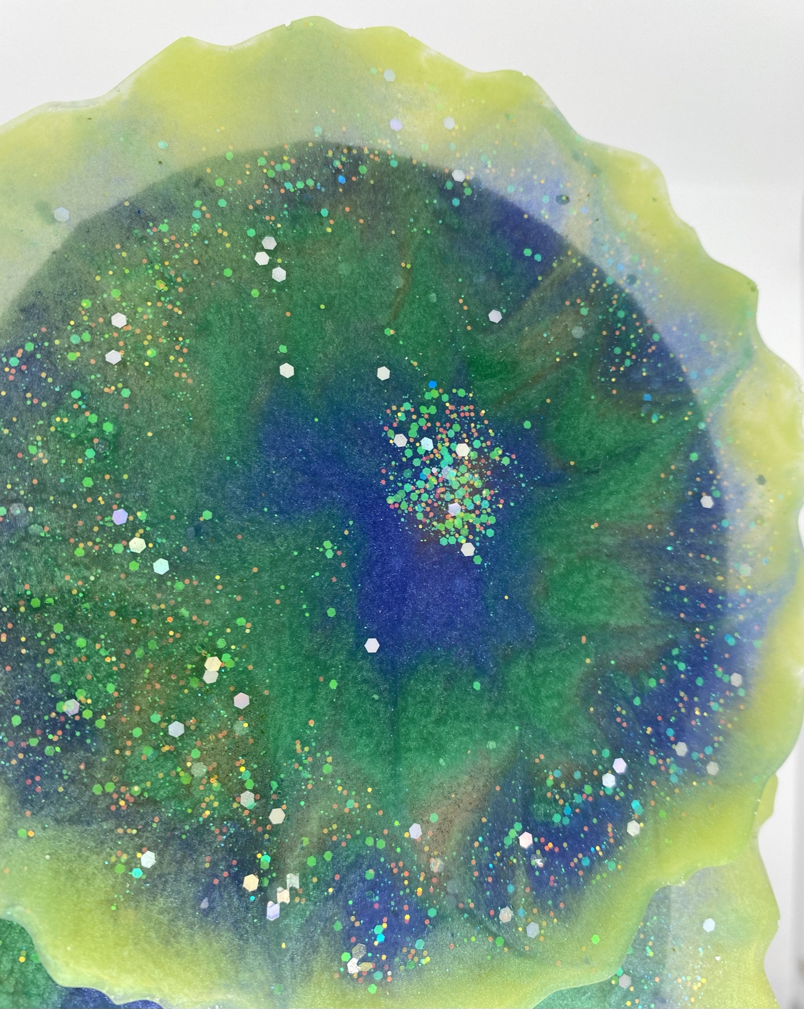 Beautiful and sparkly Green tone resin acrylic resin coasters. Set includes 4. Message if you’d like a larger set, discounts will apply
