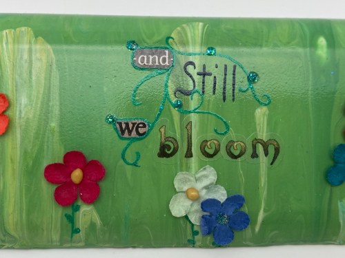 This vivid acrylic pour piece has great contrast in the cell formation and in the colors themselves. It is on a 11.25×8.25 wood contoured “box” or “tray”. It has an acrylic resin top coat for durability and shine. This piece represents the land and the seas being divided at that part of “The Creation”.