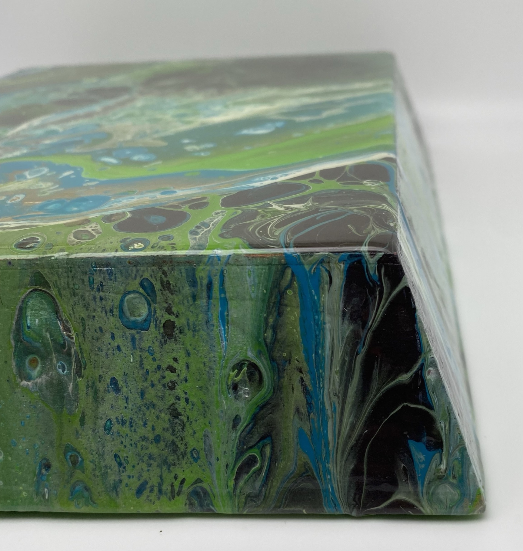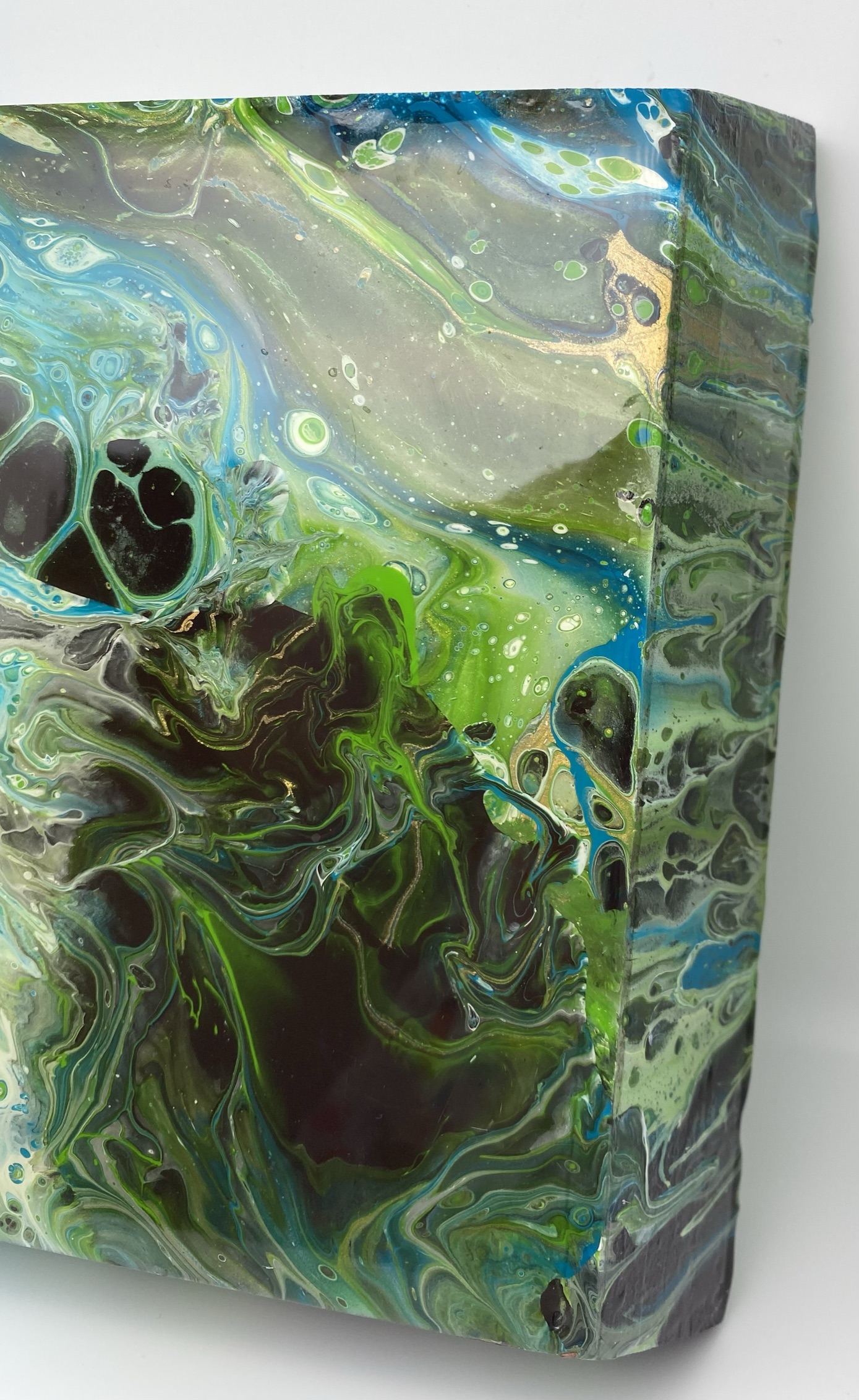 This vivid acrylic pour piece has great contrast in the cell formation and in the colors themselves. It is on a 11.25×8.25 wood contoured “box” or “tray”. It has an acrylic resin top coat for durability and shine. This piece represents the land and the seas being divided at that part of “The Creation”.