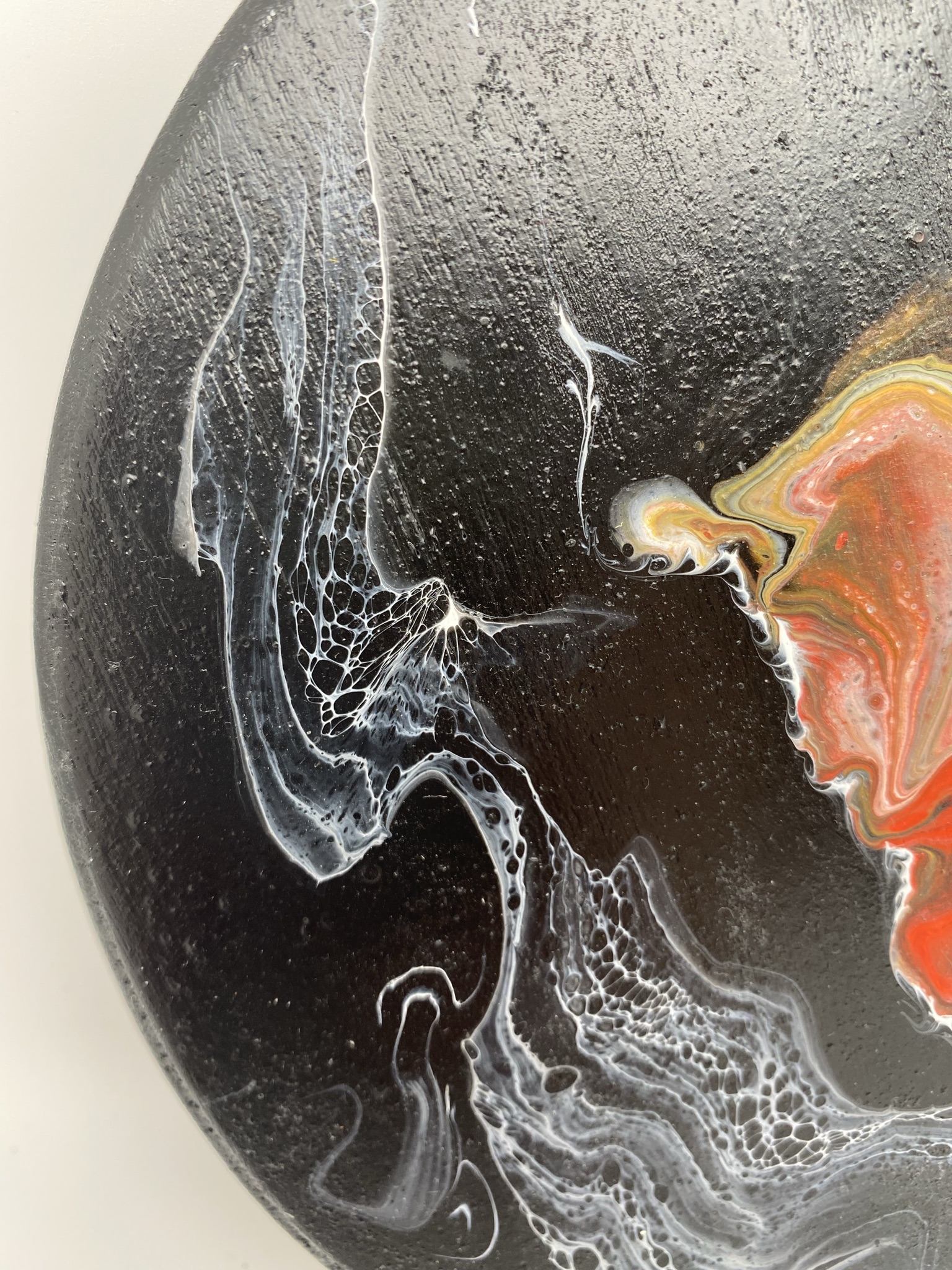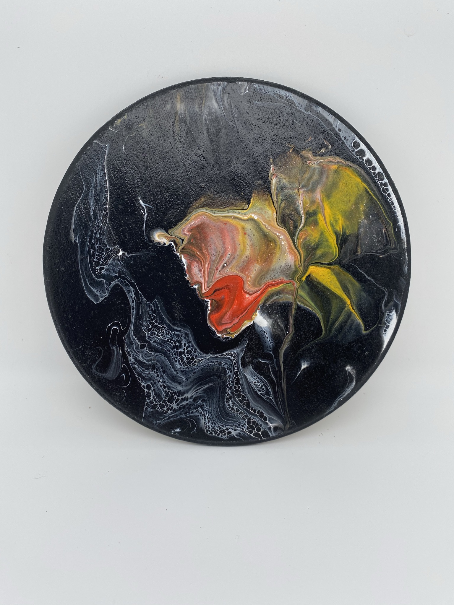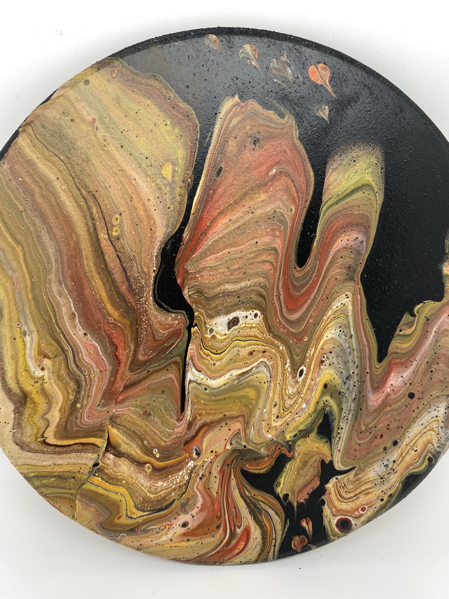 The amazing thing about an acrylic pour is that we cannot control everything about the outcome. We encourage the paint and the flow but often the image is far grander than we would expect. In this case, I admit, the paint and the pour created this with very little help from me but I immediately saw a gorgeous blooming Iris. And so this acrylic pour on 7″ round wood panel became “Midnights’ Bloom.