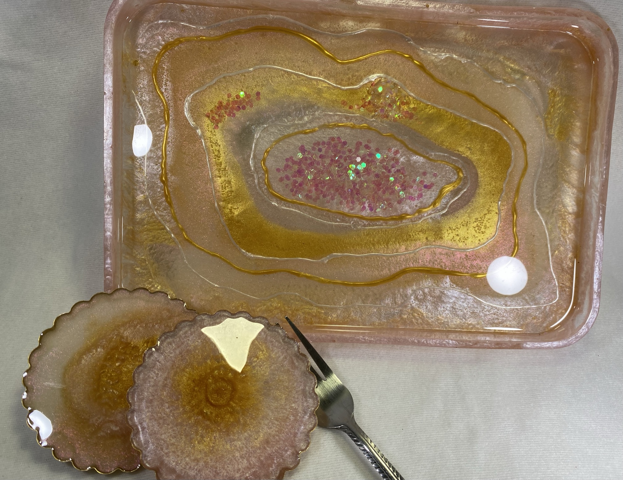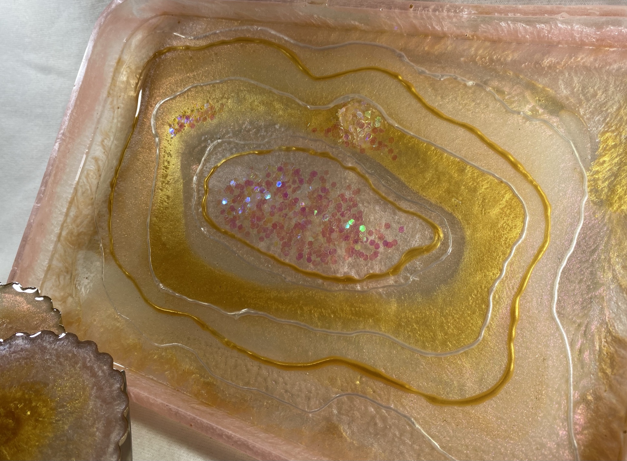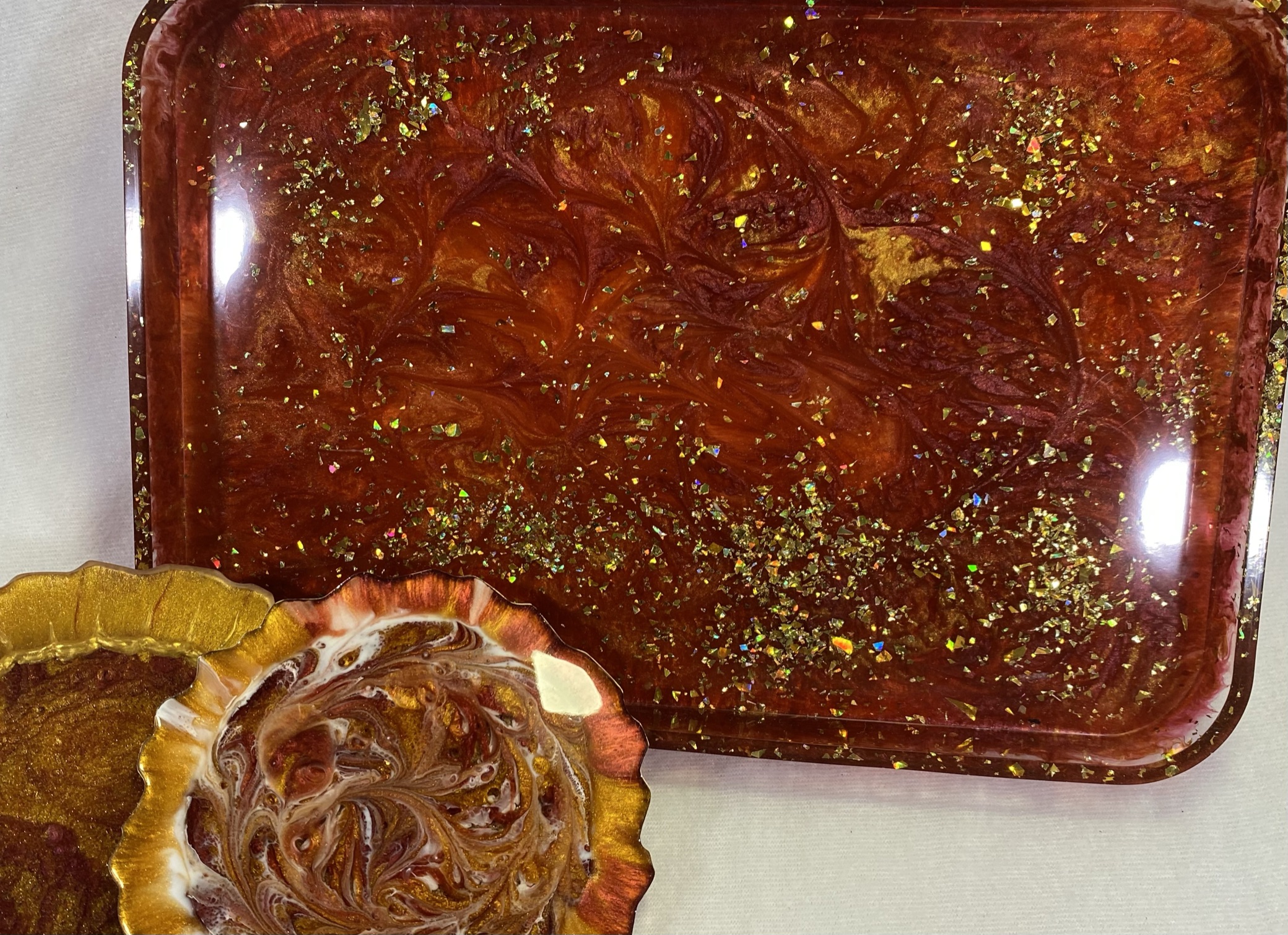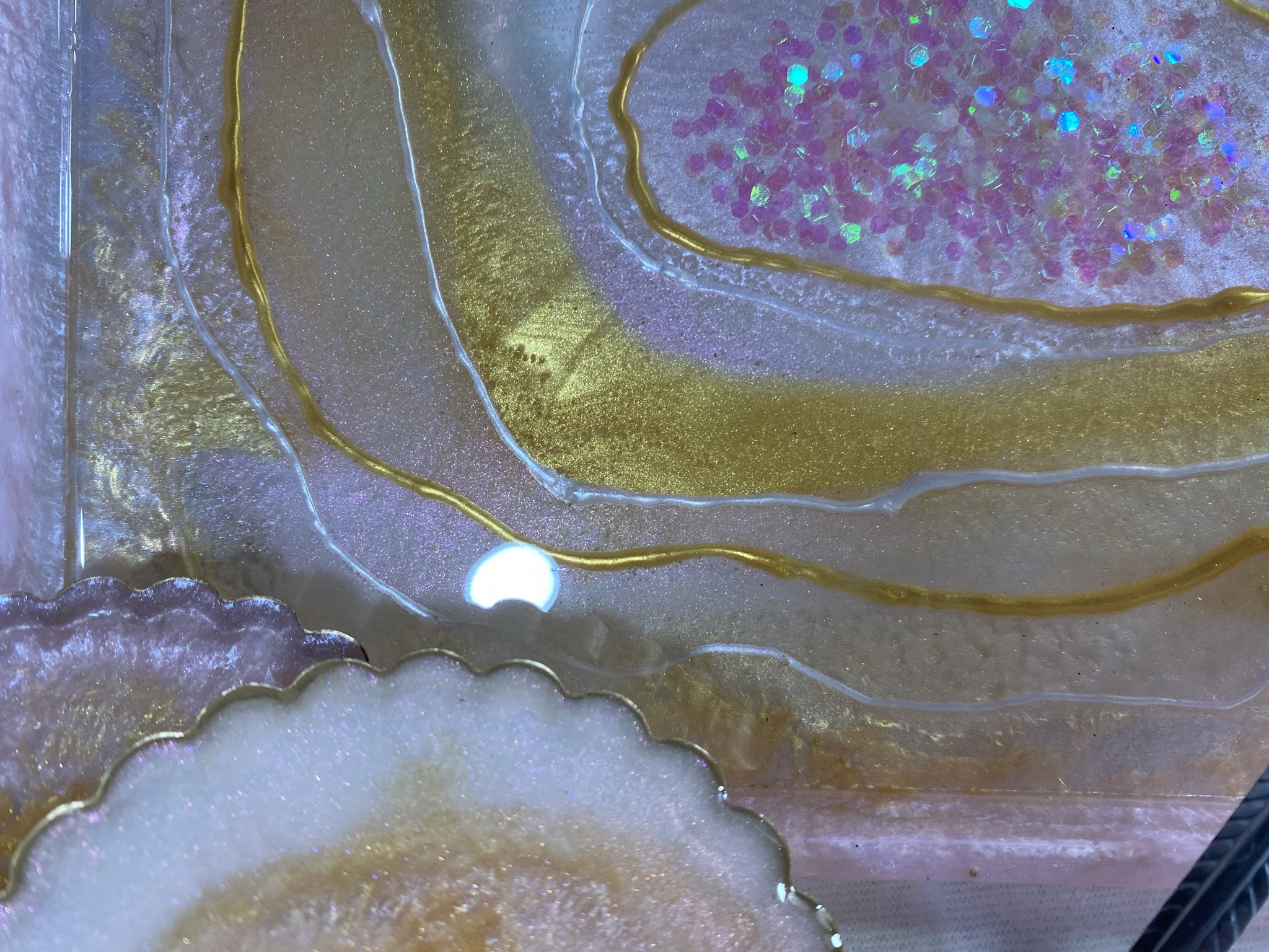 This is an 11×7.5 inch resin serving tray embellished with fine line detail and irridescent pink glitters. Beautiful and sparkling colors perfect for Christmas or for the “glam lover” at any time of the year. Comes with two equally beautiful 3.5 inch coasters inch resin coasters. Makes a great gift!