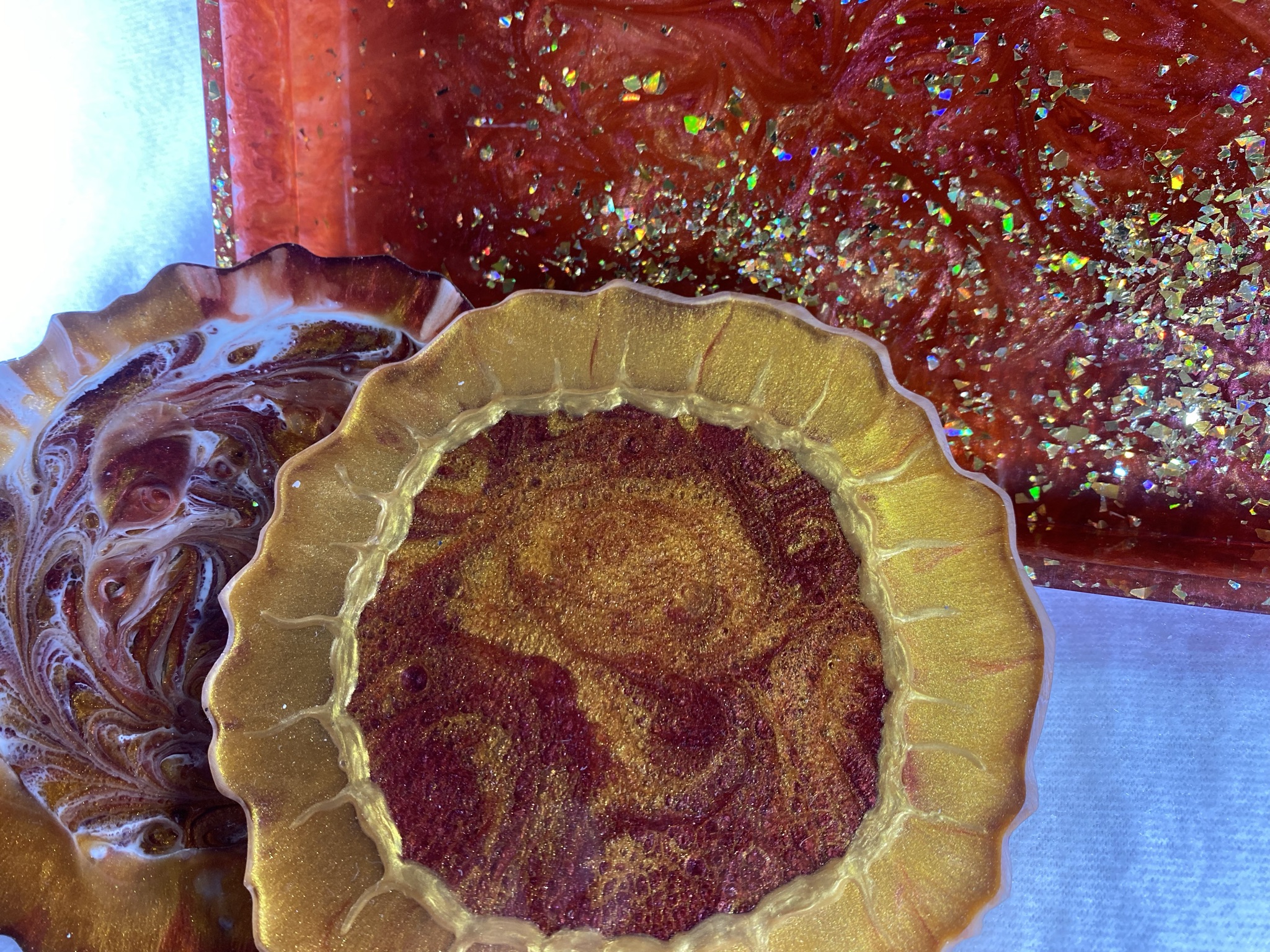 This is an 11×7.5 inch resin serving tray embellished with gold flake. Beautiful and festive colors perfect for Christmas, Fall or for the “glam lover” at any time of the year. Comes with two equally beautiful 5 inch resin coasters.