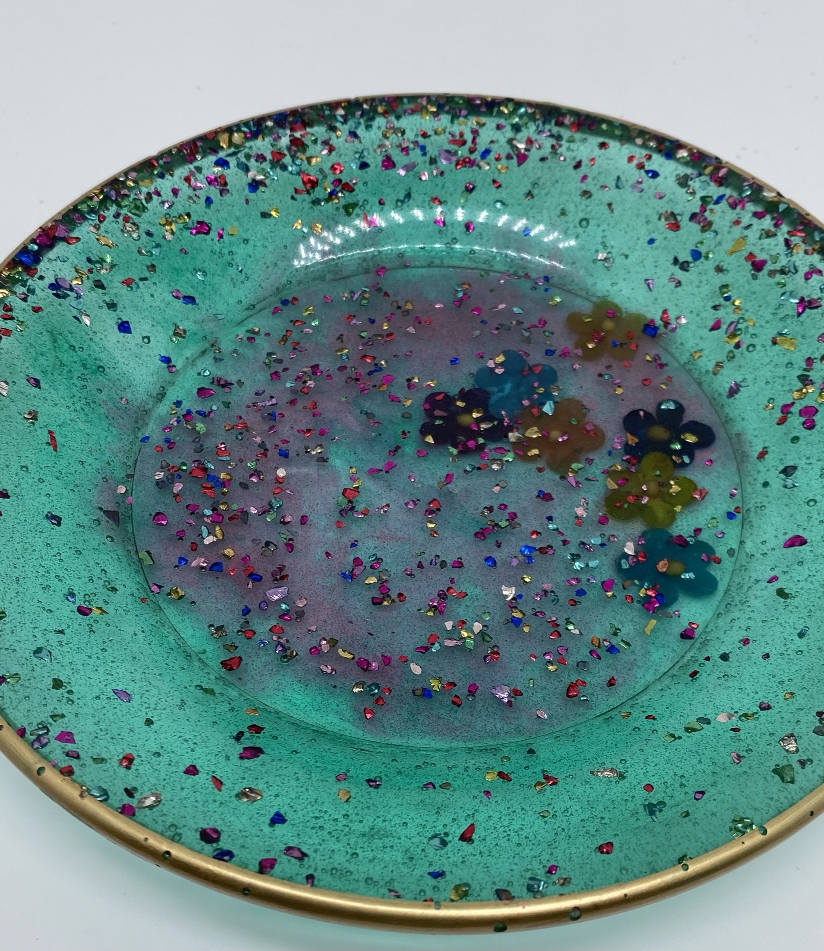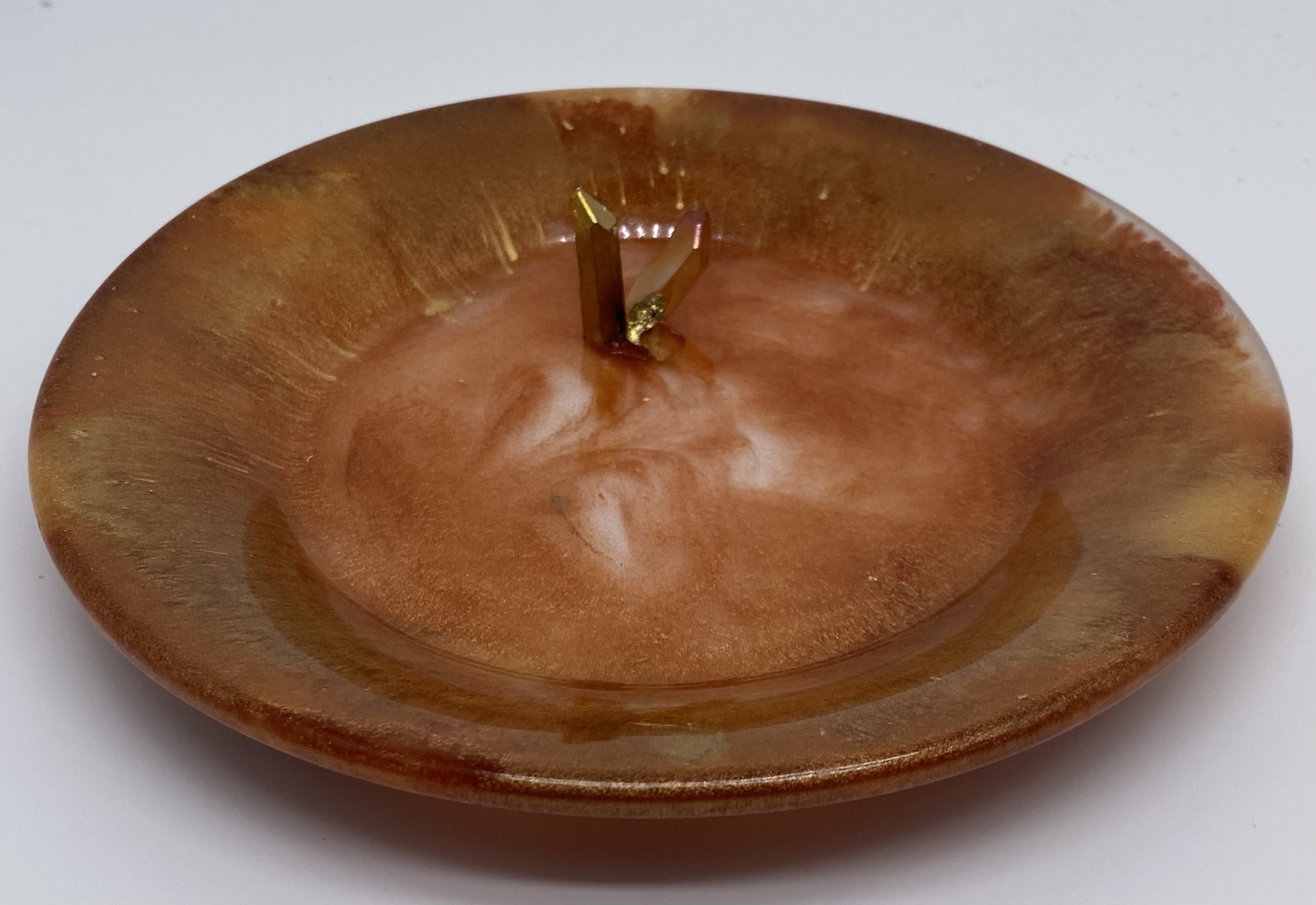 Pretty resin molded trinket dish with ring post of glass “crystal-like” form. This dish was made using metalic color pigments poured, heated and blended into a silicone mold and allowed to cure before adding the ring post. It is 6.5 inches round and would be a beautiful and useful addition to any decor.