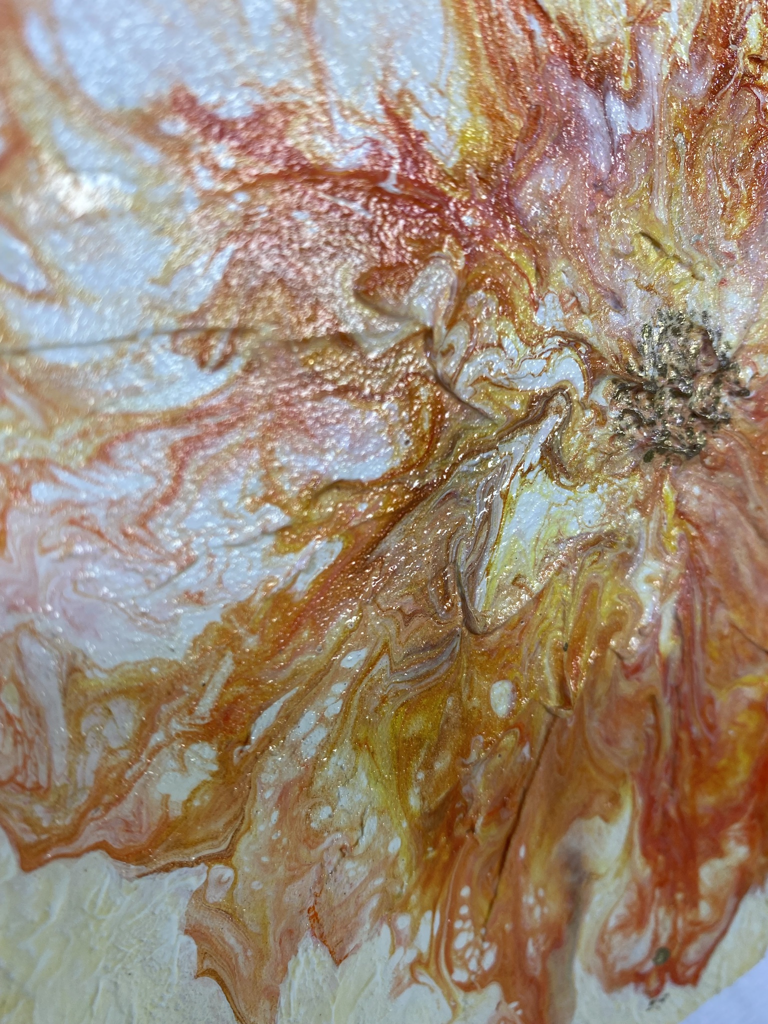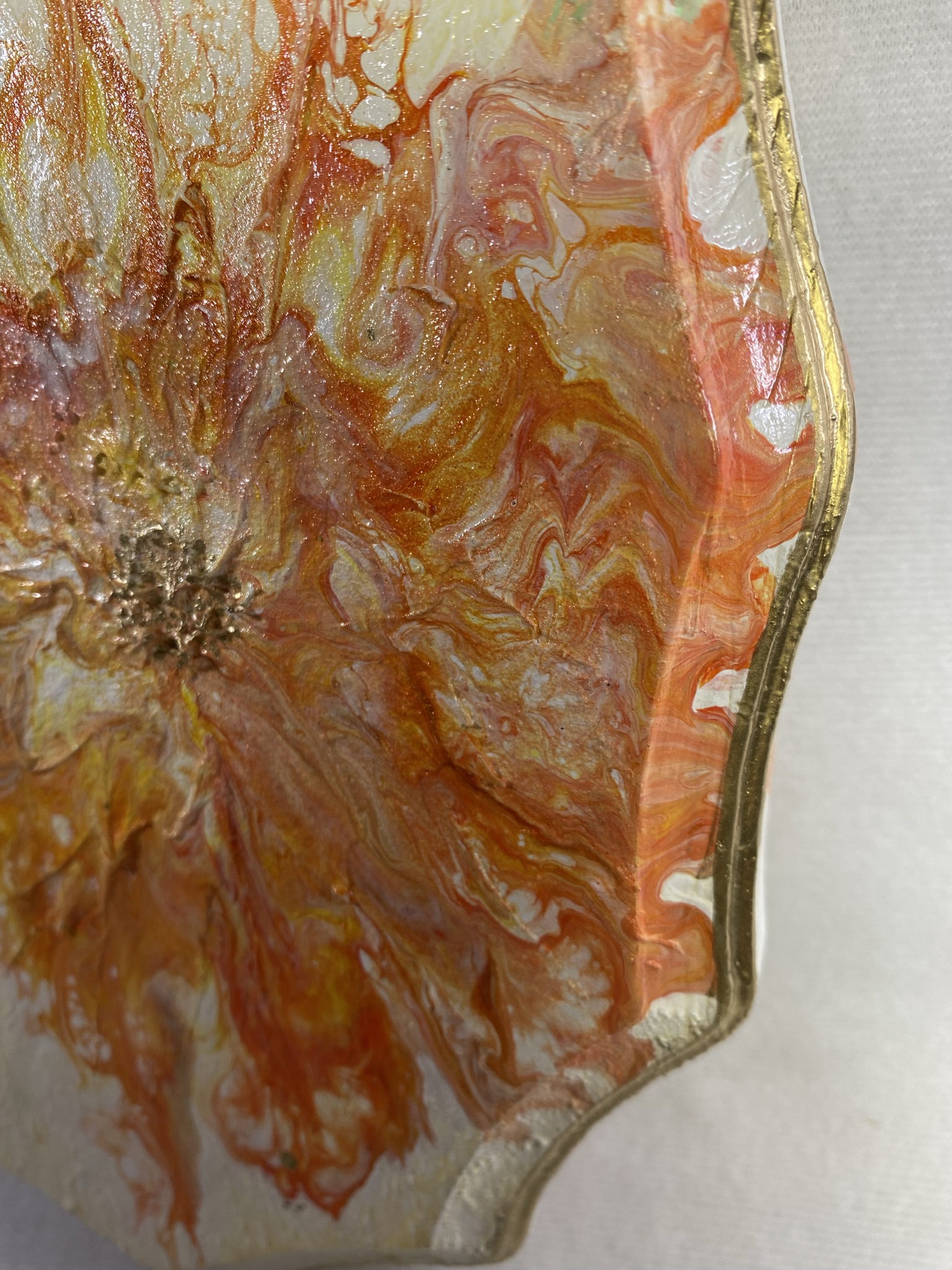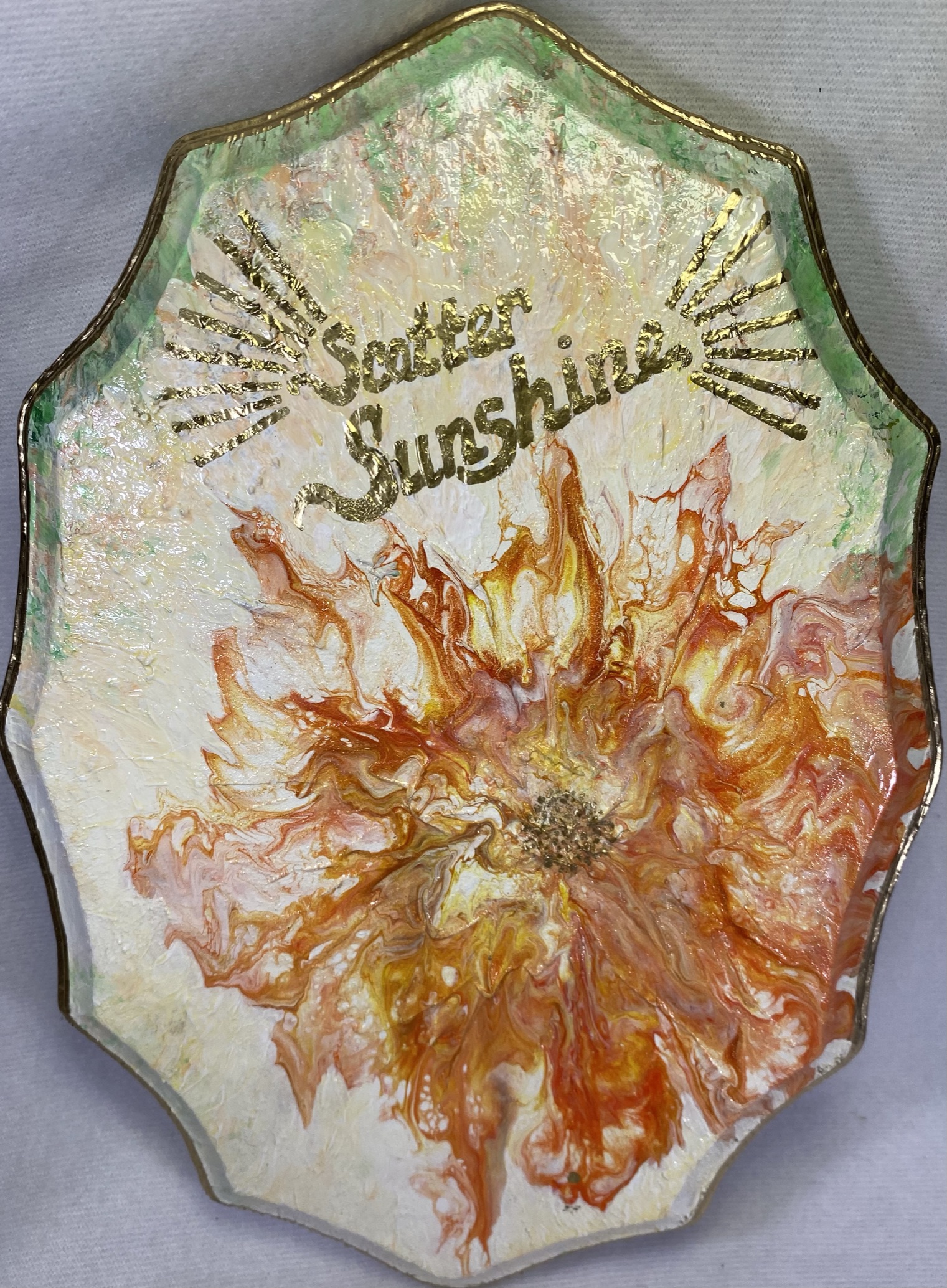 This fun and bright mixed media piece is on an approximately 10x6x1decorative wood plaque. A unique textured acrylic pour in vivid orange, yellow and gold is framed in with gold trim and the phrase “Scatter Sunshine. This is a lovely piece reminding us to share happiness wherever we go. Makes a great gift or fun piece just for you.