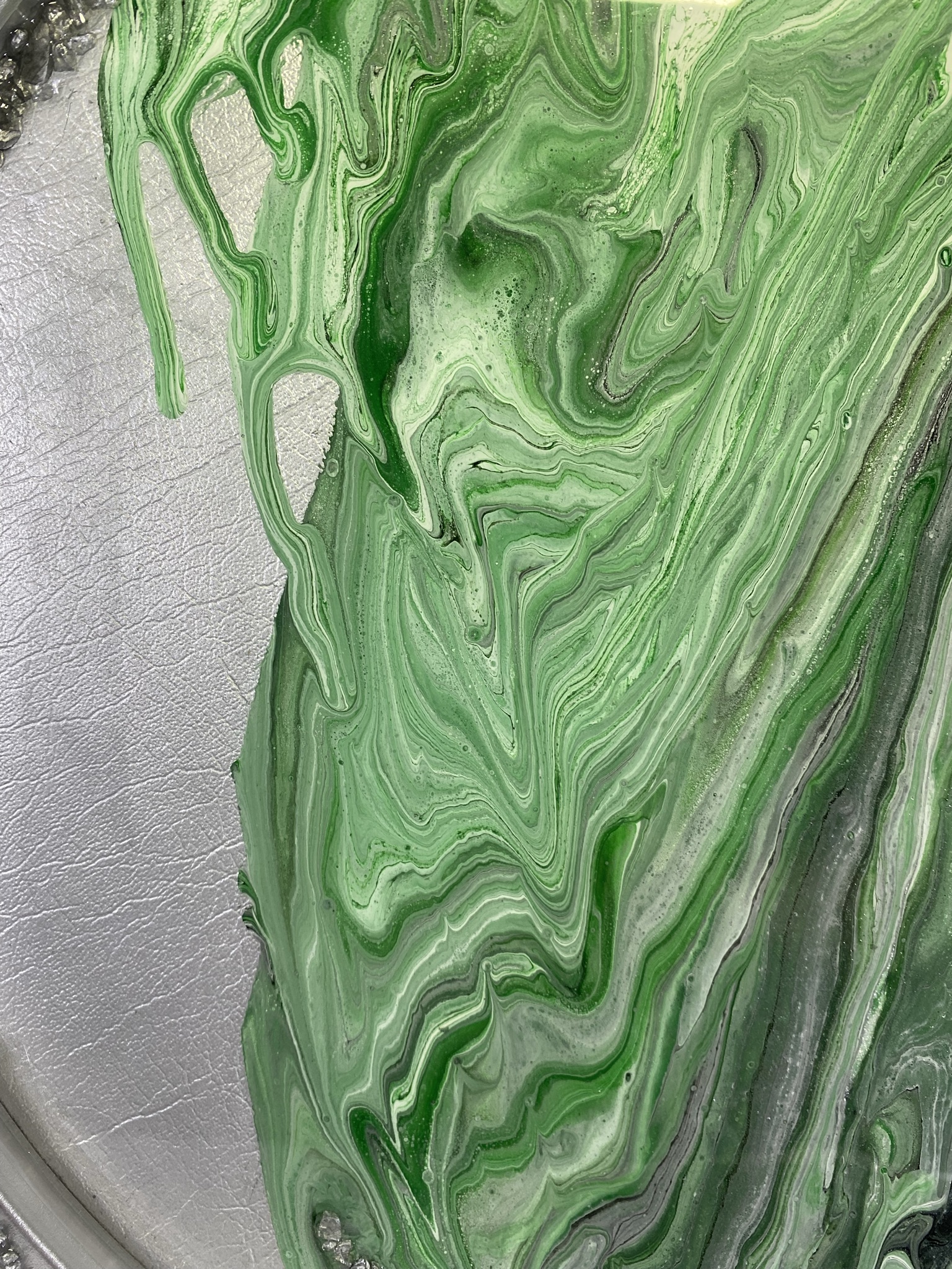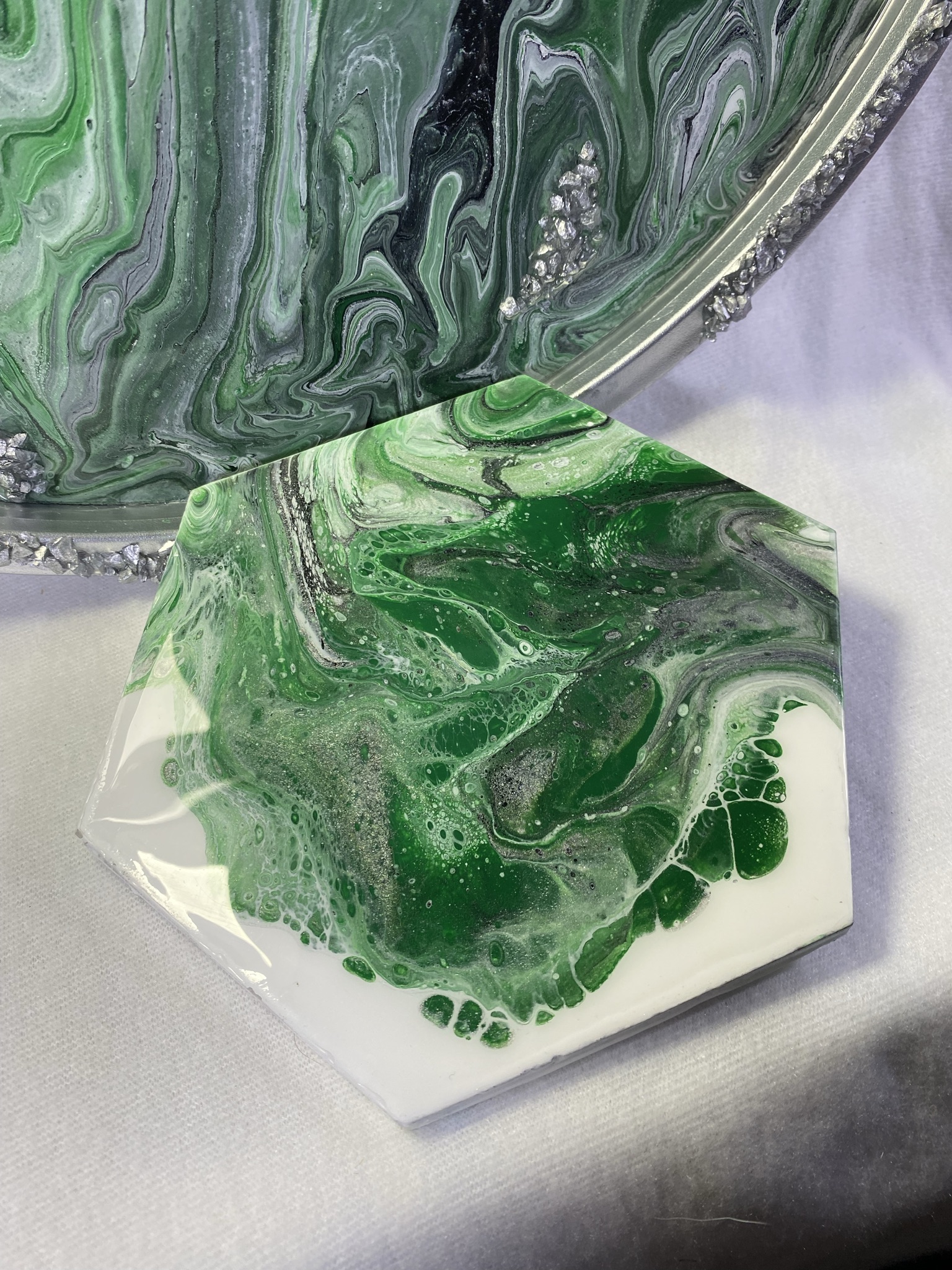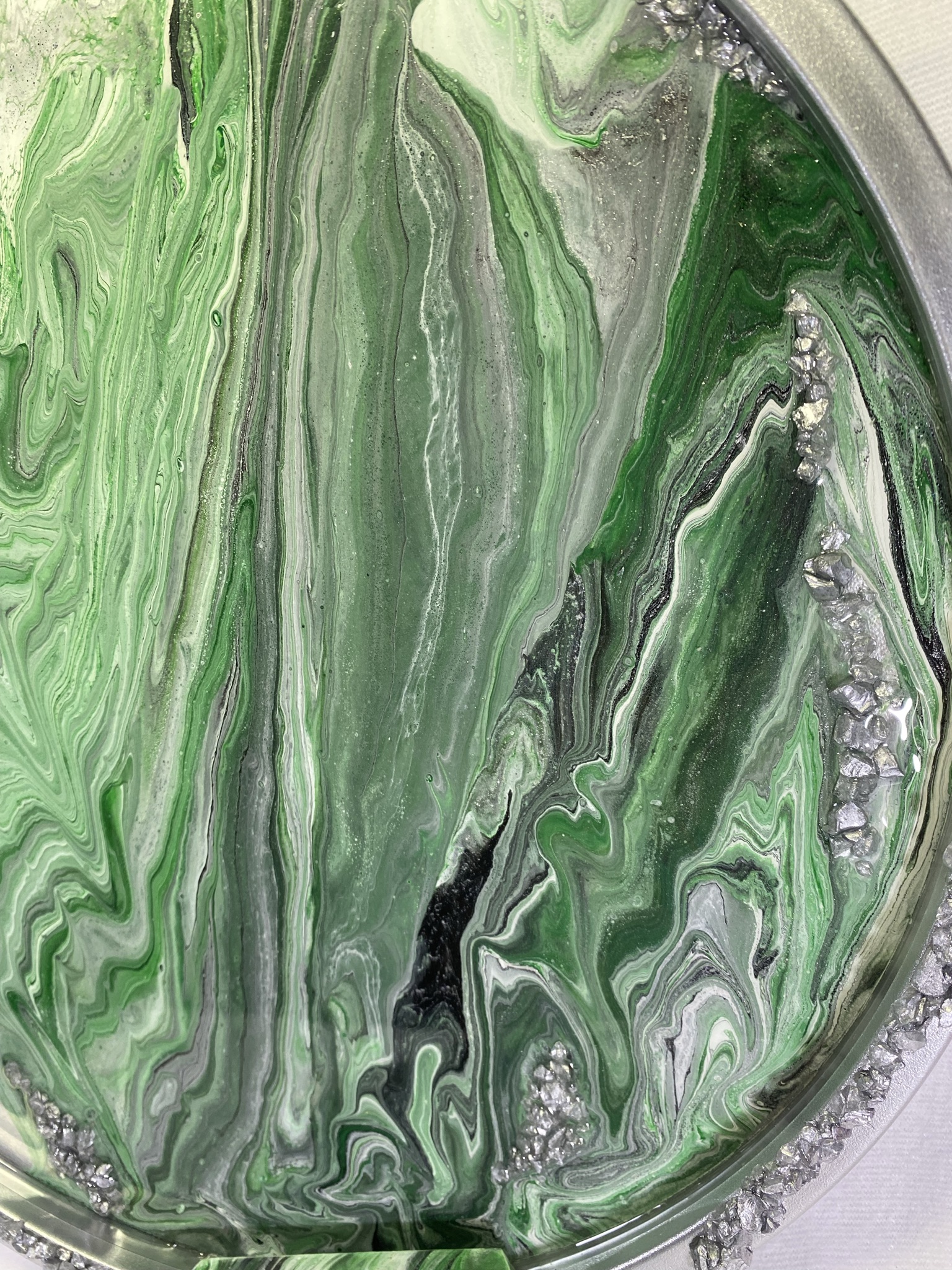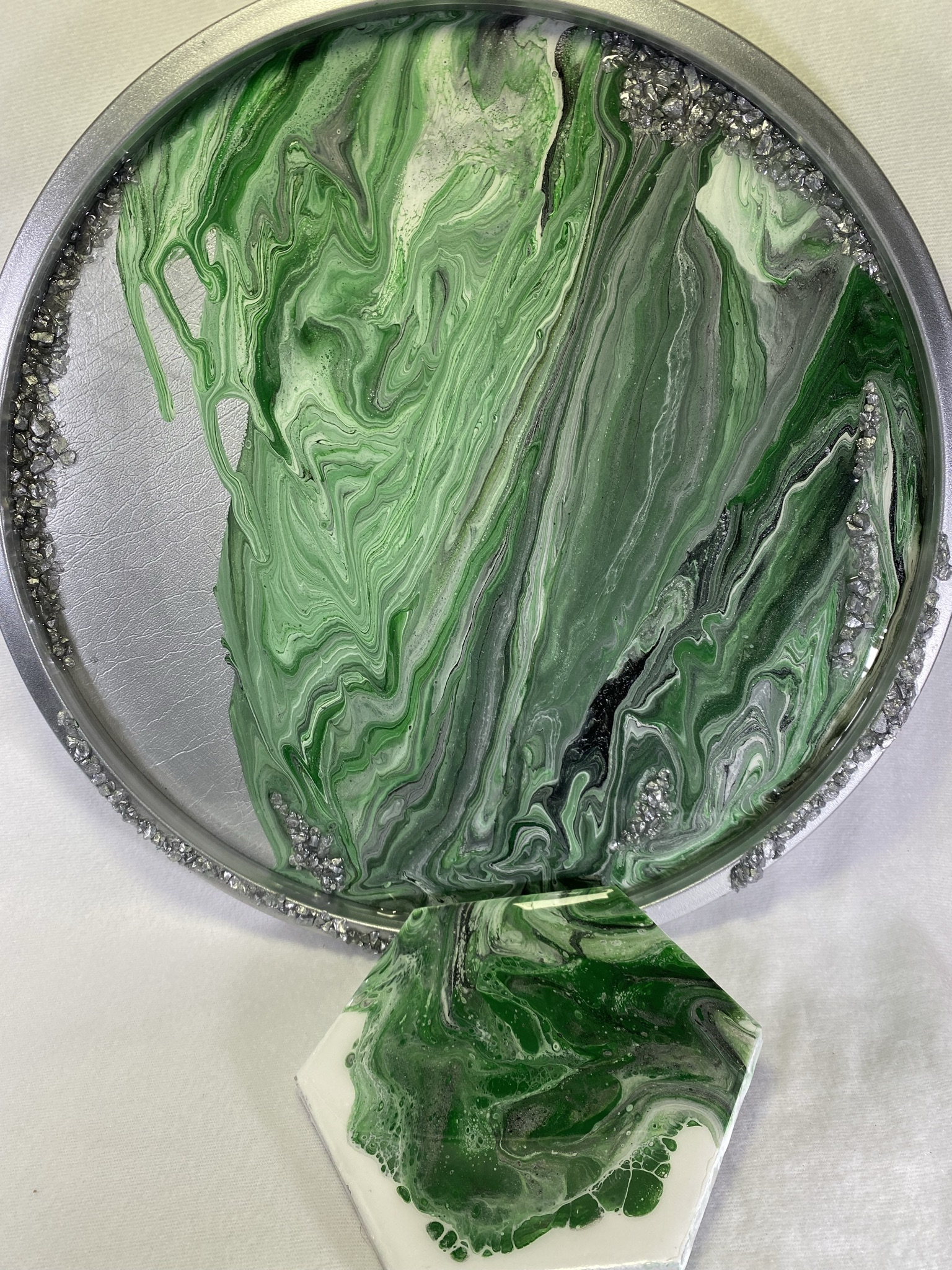 Art with a purpose! This beautiful serving tray and trivet set will be a hit at your next gathering. This is an acrylic pour embellished with silver stones and a top coat of heat resistant resin. This duo would make this a perfect gift or awesome display for your favorite snacks. Custom sets available. Click on the “contact me” link and lets chat. Remember no two are exactly alike.
