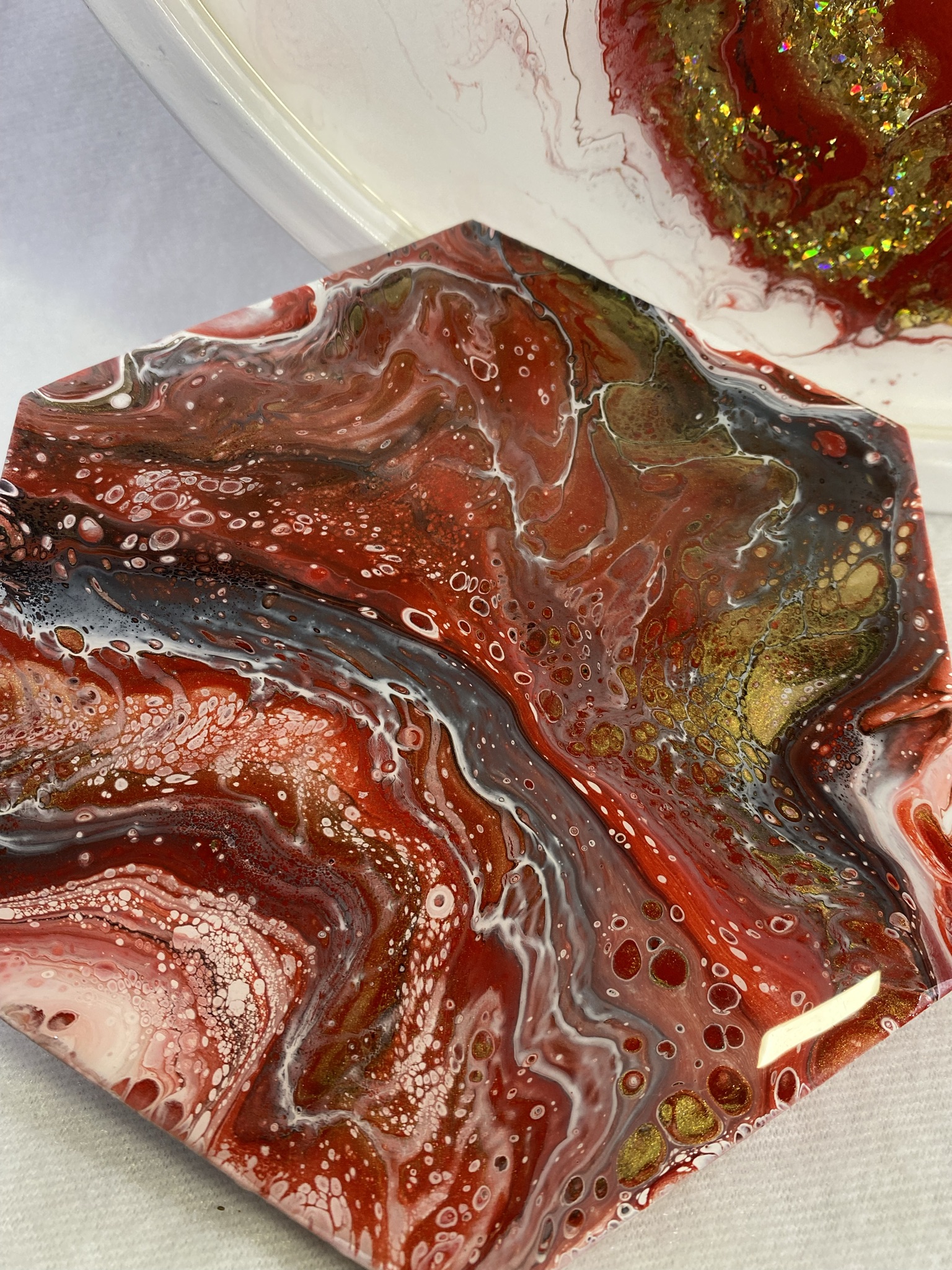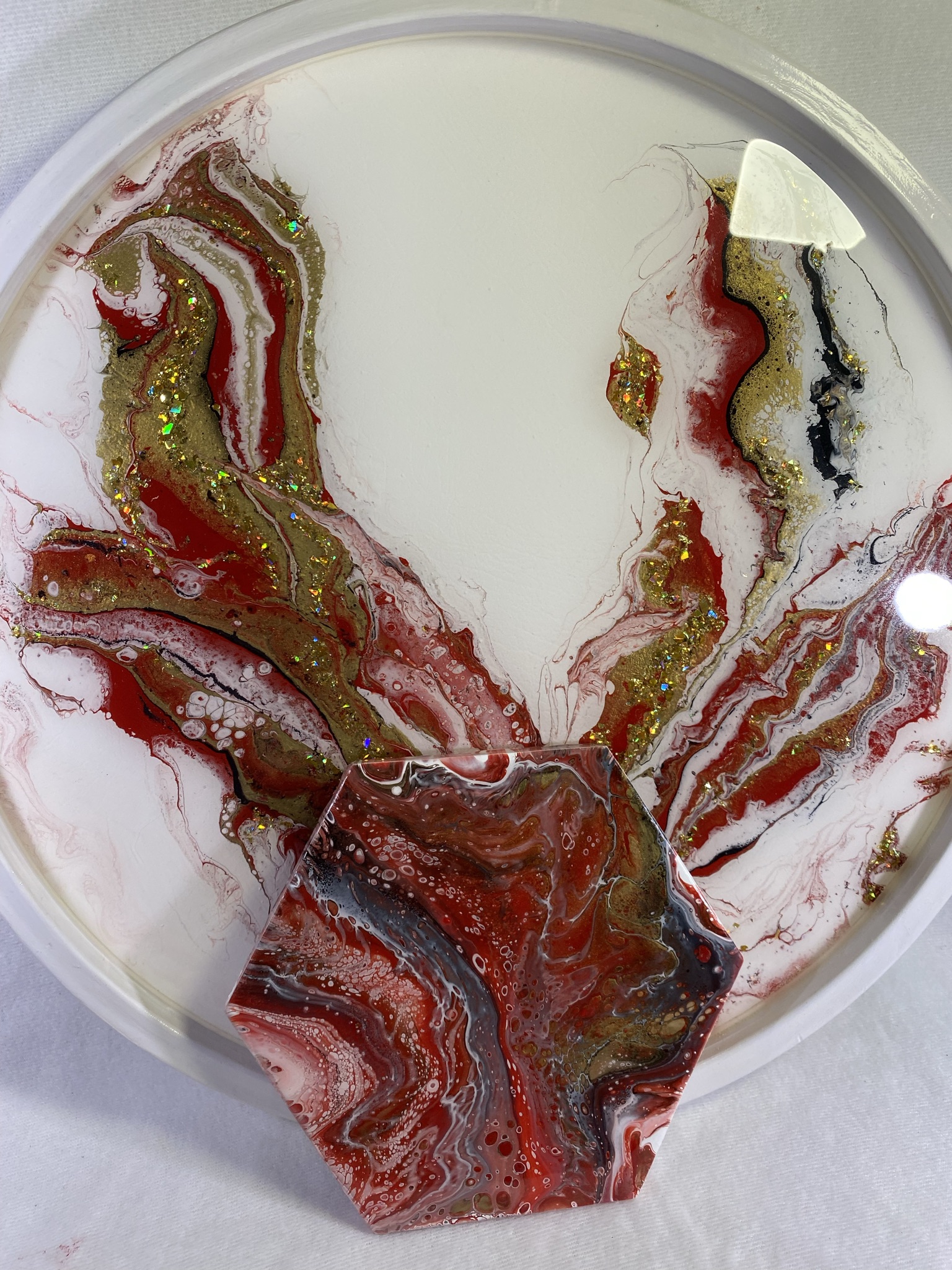 Art with a purpose! This beautiful serving tray and trivet set will be a hit at your next gathering. This is an acrylic pour embellished with gold flakes and a top coat of heat resistant resin. This duo would make this a perfect gift or awesome display for your favorite snacks. Custom sets available. Click on the “contact me” link and lets chat. Remember no two are exactly alike.