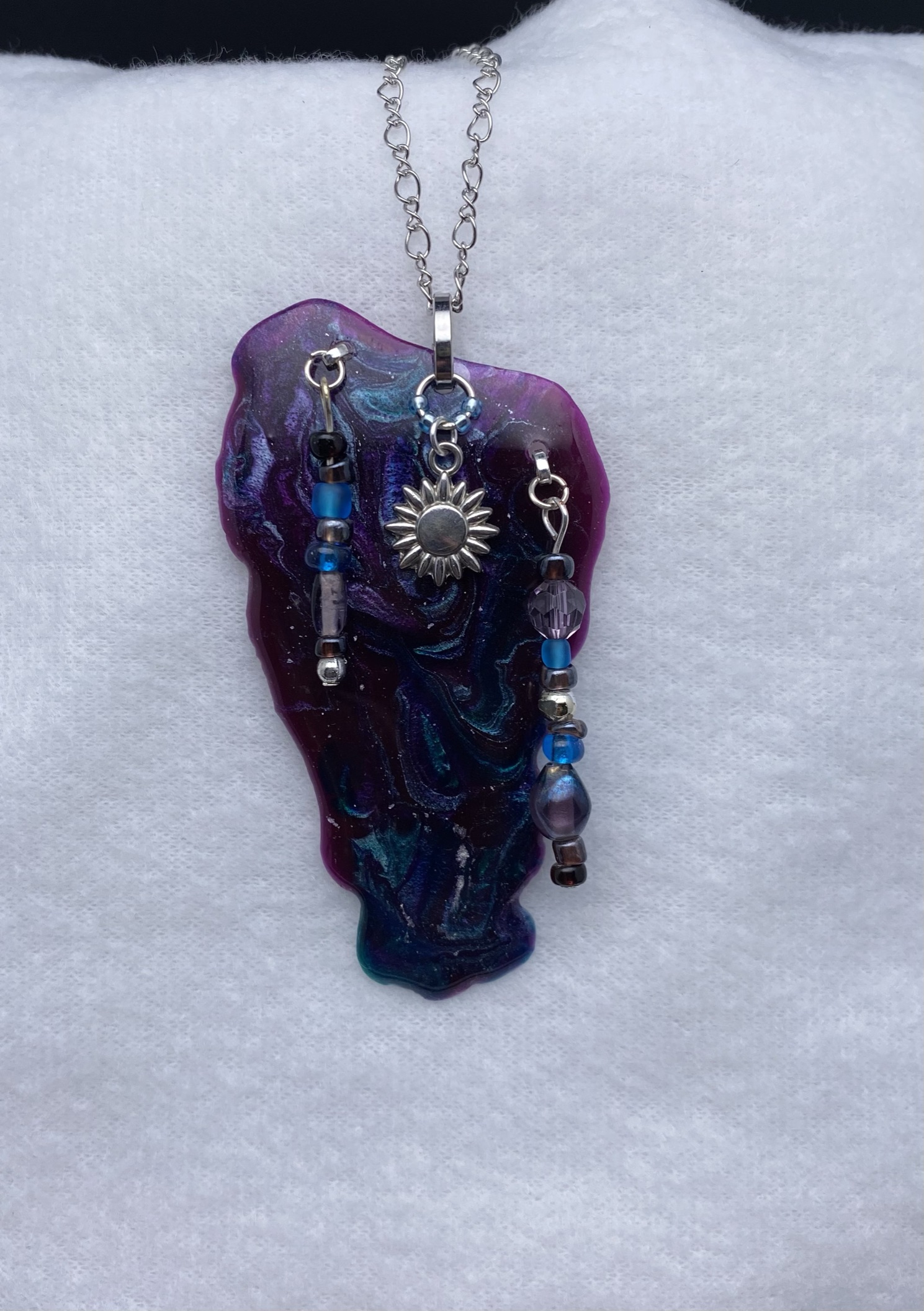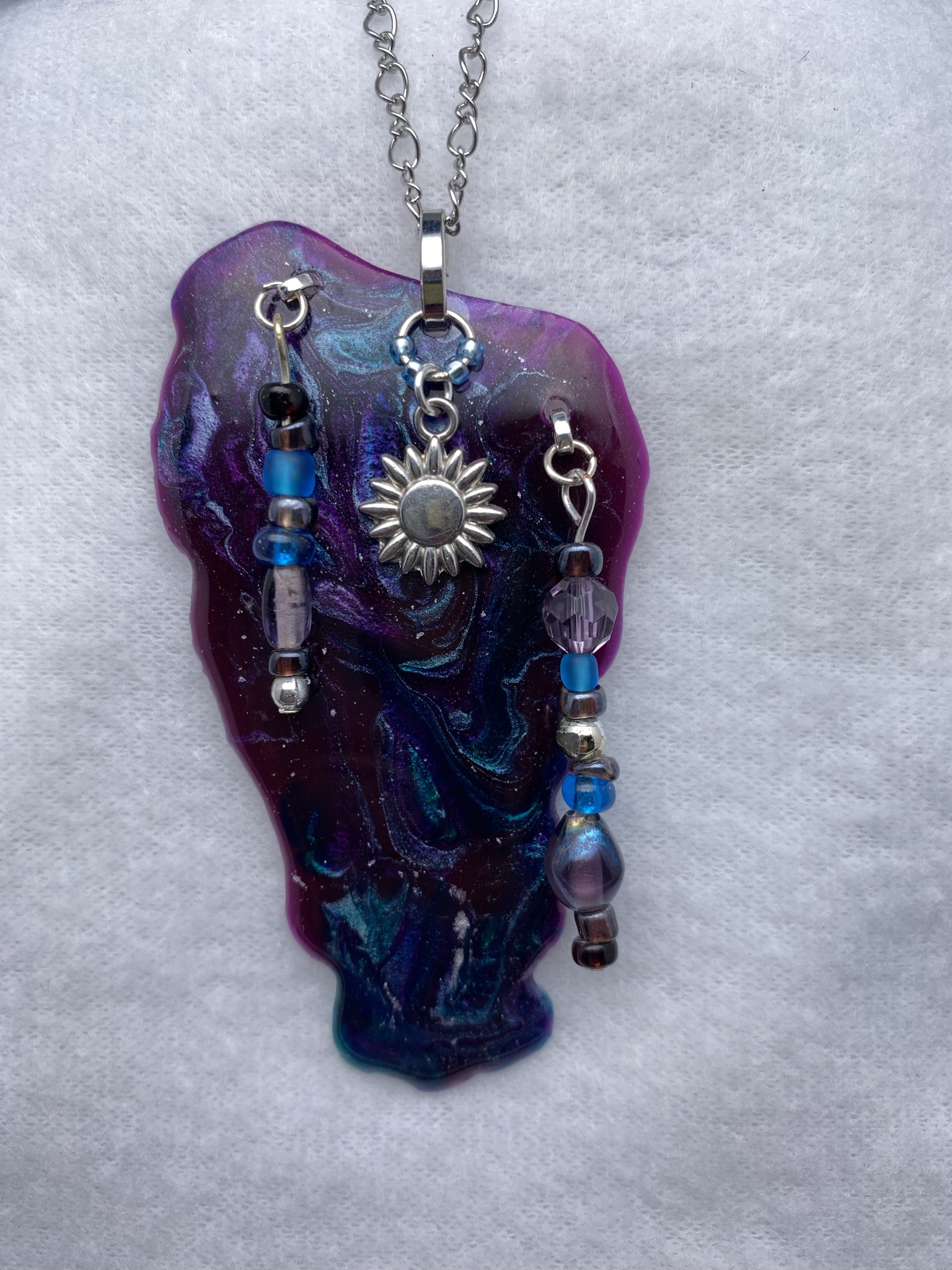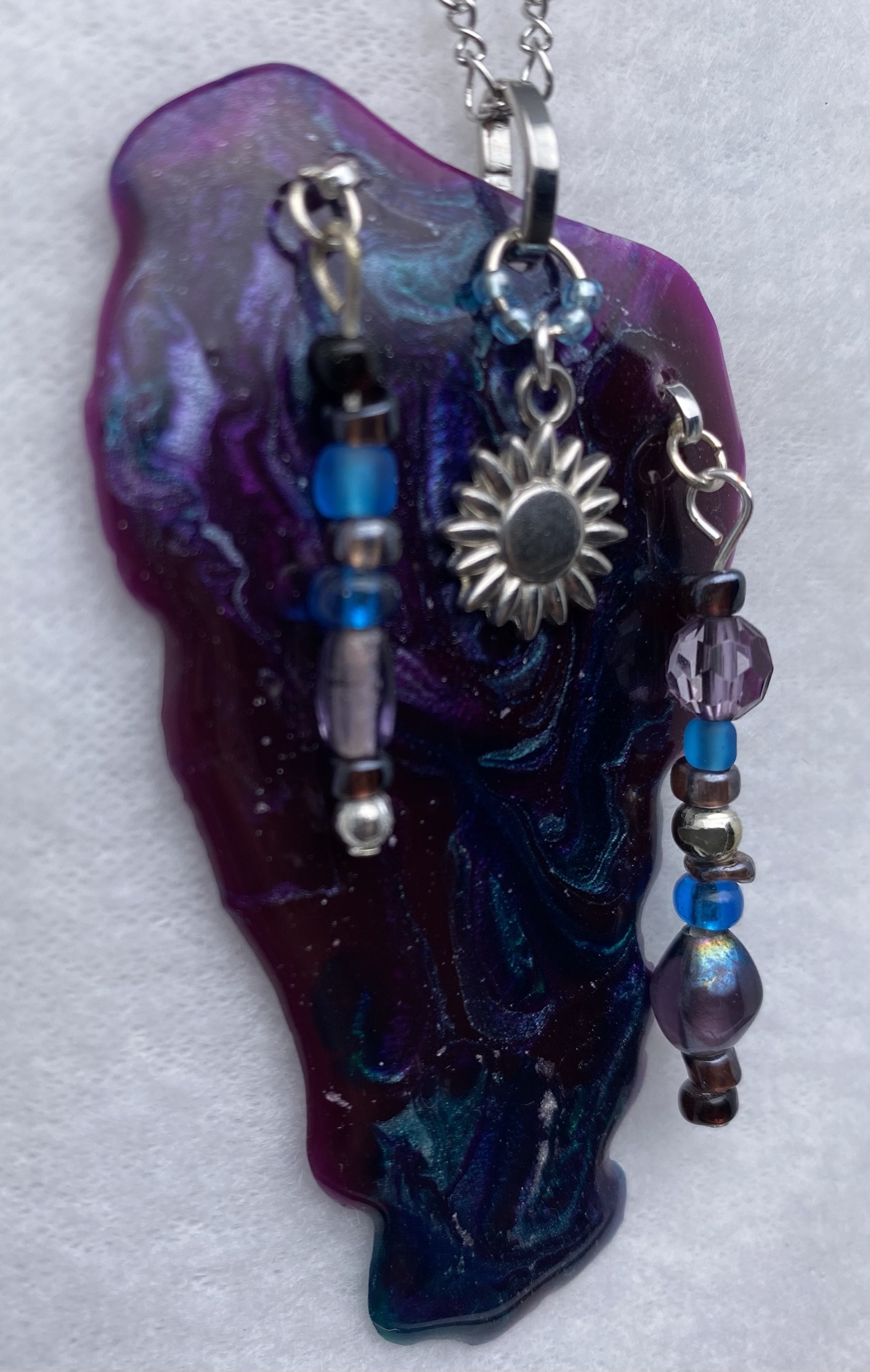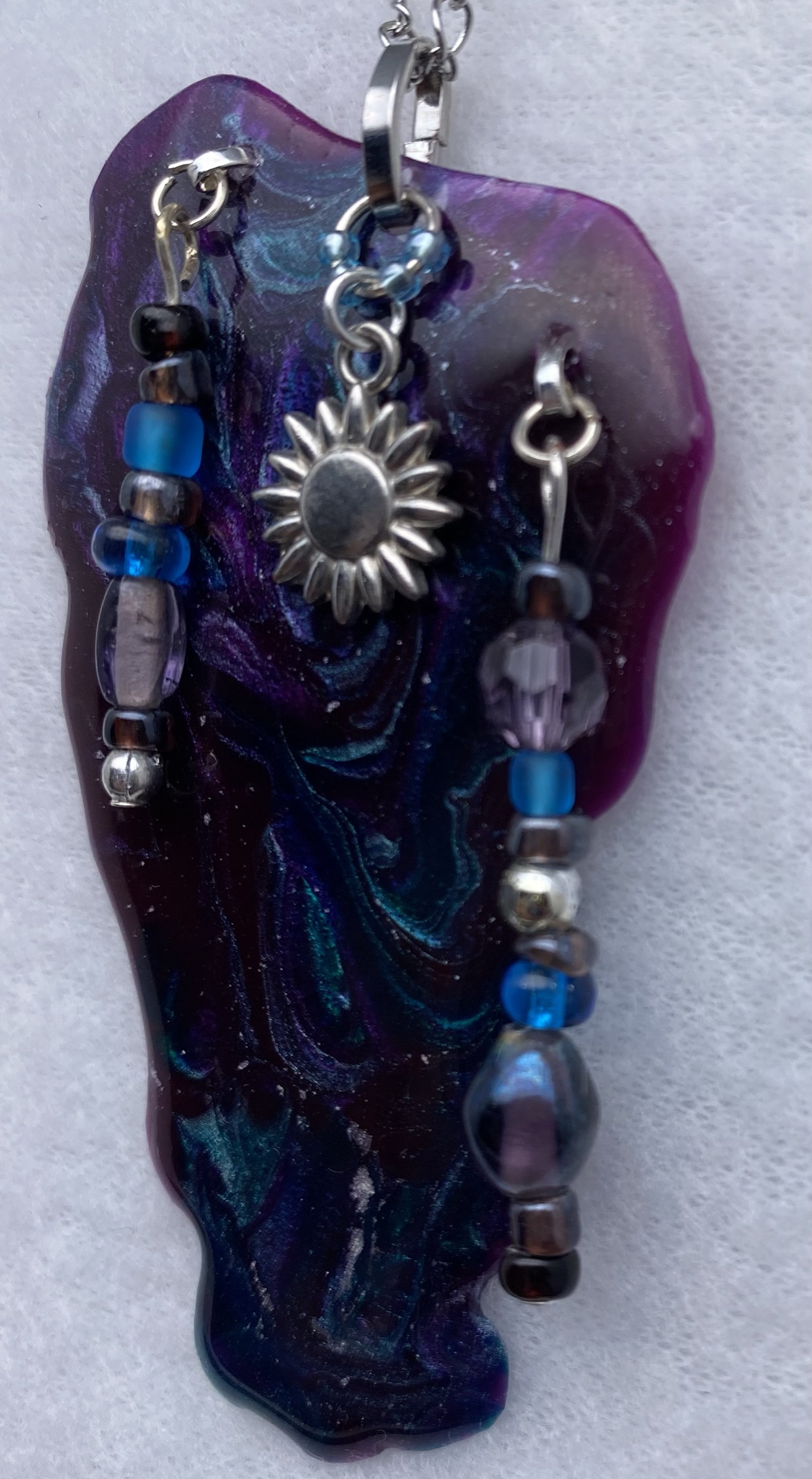 Gorgeous deep purple with frosted highlights of teal and lavender really make this piece a show stopper. Lovely quality beading and sun charm dangle freely for beauty and interest. This is a true one of a kind piece of wearable art and would make a great gift for you or anyone on your list that appreciates art, jewelry or uniqueness. Currently on a 21″ chain. Message if you have an alternate preference.