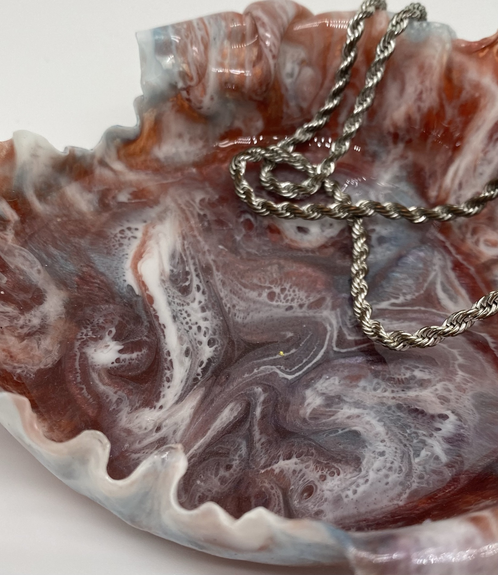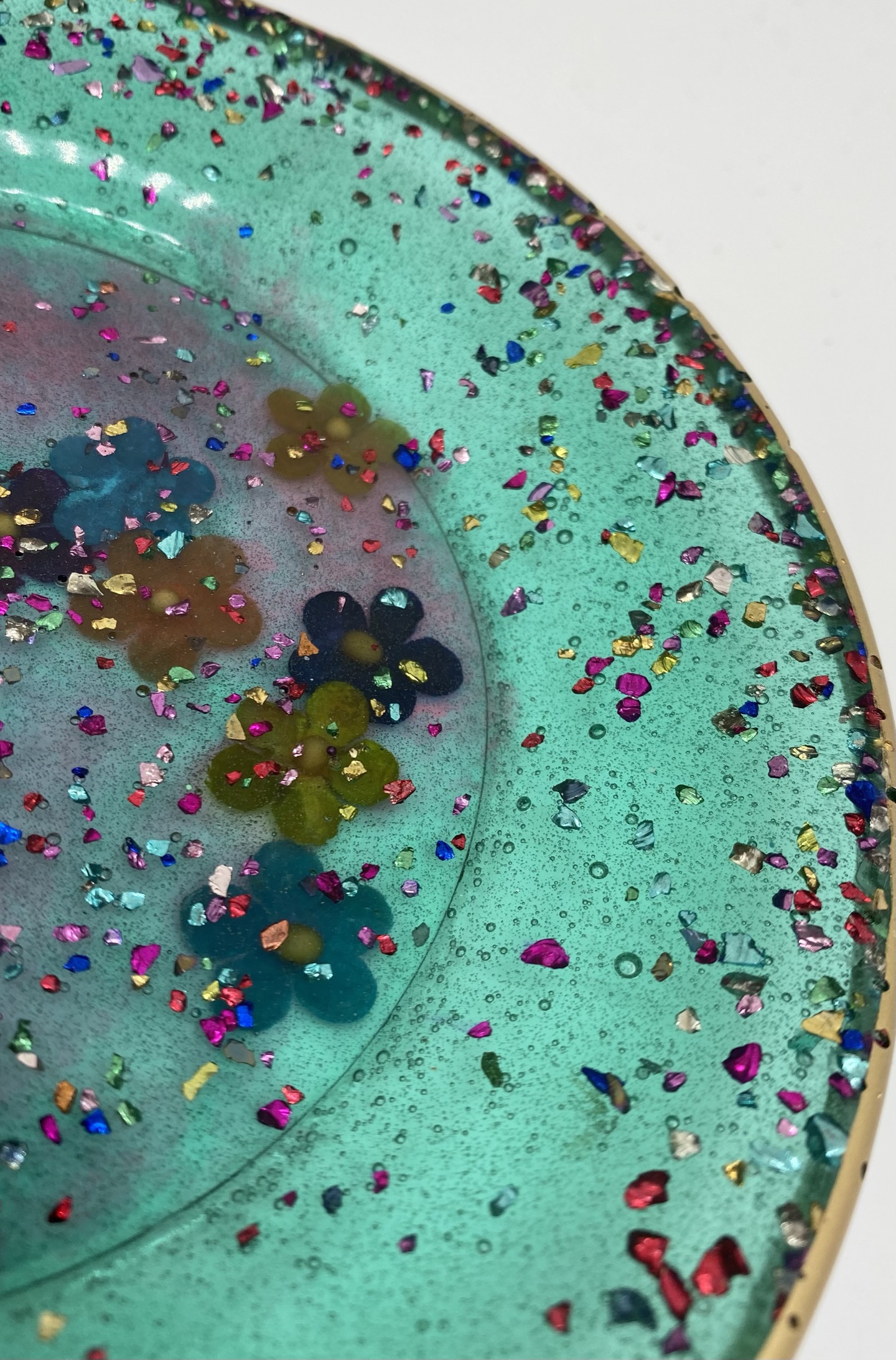 Pretty little 6.5 inch round resin trinket dish. Perfect for your rings and things and colorful enough to bring cheer to any room in the house. Makes a great gift!