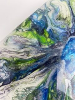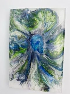 Exciting, fun, vibrant mini bloom. This acrylic pour is on a 4x6x1 wood panel and has a resin top coat for shine and durability. The sparkle in the blue and green make this little piece really pop and the cell action of the pour creates awesome detail. Custom orders in this style always welcome