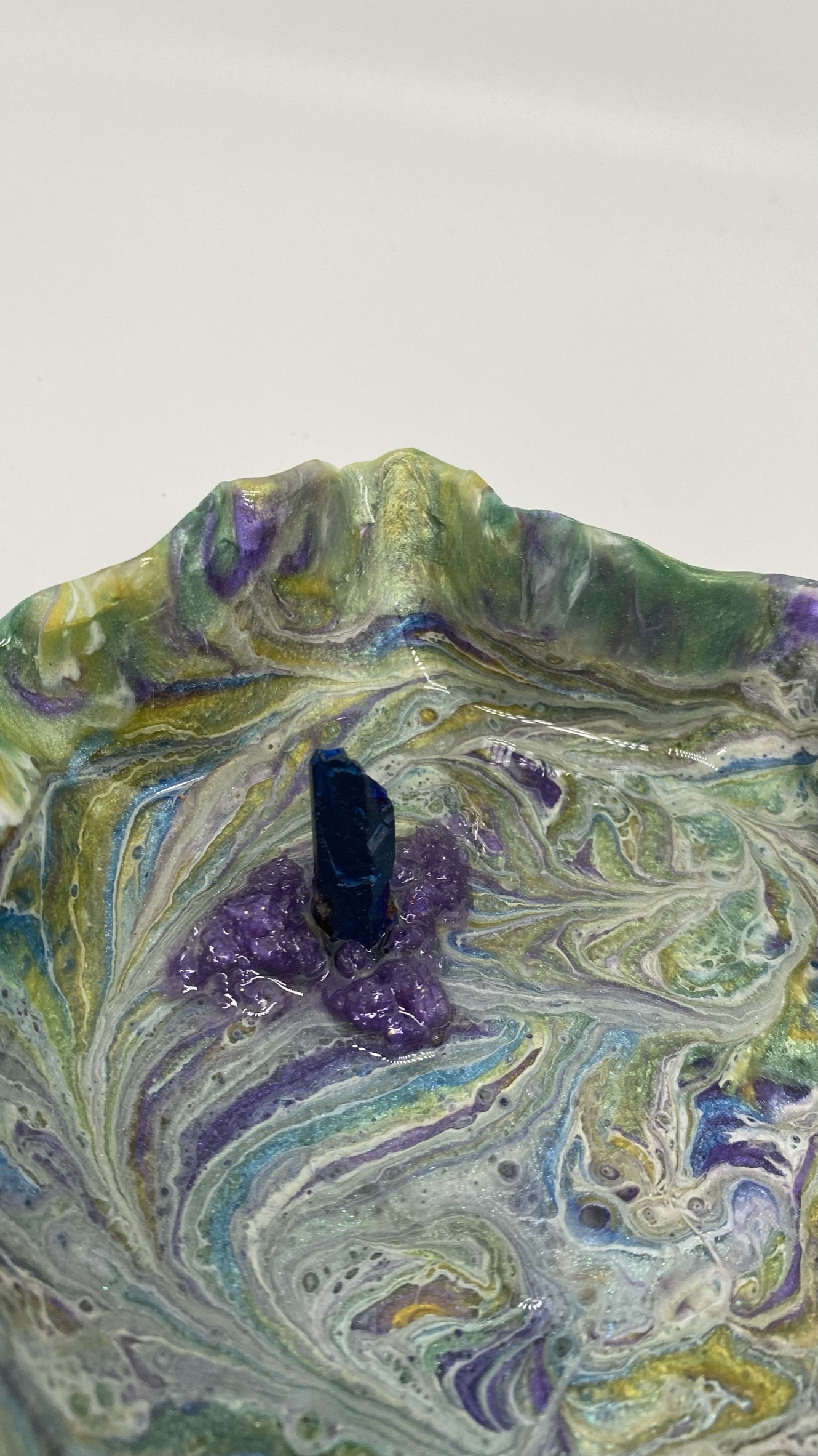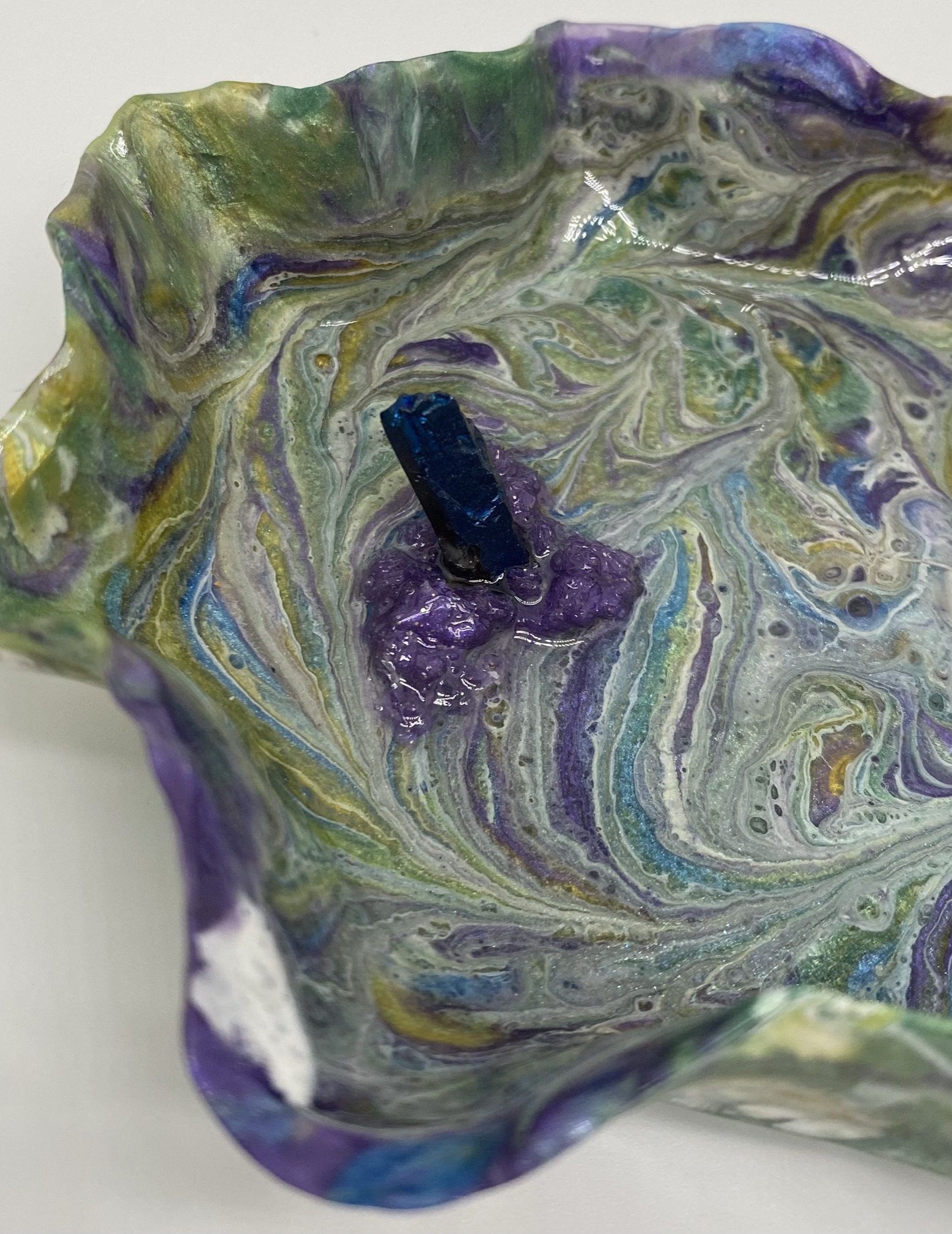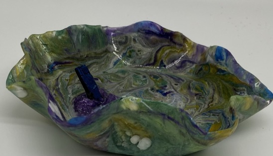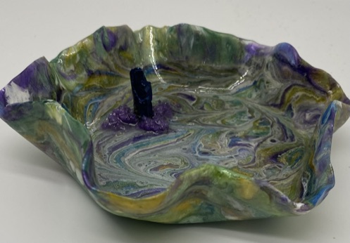Multicolored Trinket dish with blue glass “crystal-shaped” ring post and purple crushed glass embellishment. This fun and bright acrylic resin piece is created with a “free-form” and circular “hand shaped” style. Many colors of pigments were used to create the perfect, striking combo for this one of a kind purposeful art piece. it is approx 5.5″, (ring not included)