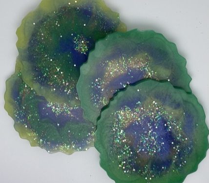 Out of stockBeautiful and sparkly Green tone resin acrylic resin coasters. Set includes 4. Message if you'd like a larger set, discounts will apply